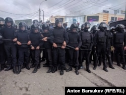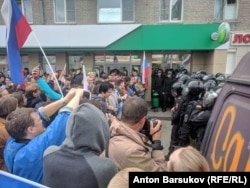 В Новосибирске около Центрального РОВД путь колонне преградили бойцы ОМОНА. Нескольких человек выхватили из толпы и отвели в полицейские автобусы. Участники акции протеста не предпринимают активных действий, стоят на месте и скандируют "Мы защищаем народ". Выглядит это так: