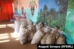 В коридоре выставлена батарея бутылок с водой, напротив – куча пакетов с вещами. Местные разбирают эти завалы – выбирают себе одежду. В полузаброшенном актовом зале опять разруха и гуманитарка – с десяток мешков картошки, вода. На обшарпанной стене – портрет Путина, текст гимна, фото флага и герб.