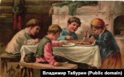 – Серия "Пословицы в лицах", нарисованная для фирмы "Зингер", на выставке не представлена. Однако открытки из этой серии хранятся в фондах Музейного комплекса им. И. Я. Словцова. Они появились у нас еще до "Детского МИРа", – уточняет Лев Боярский. – На выставке представлены военные открытки Владимира Табурина 1914–1916 годов: "Ни с небом, ни с ветром не дружись...", "В тесноте, да не в обиде", а также уже упомянутая серия "Дети-политики" 1917 года.