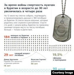 Удалось подтвердить, что в Бурятии родилось 143 из 184 погибших. При этом в столице республики Улан-Удэ только 23 человека, а 120 — в остальных районах. Всё население Бурятии — 980 тысяч человек, в Улан-Удэ проживает 437,5 тысячи. Получается, что на столицу, где живёт почти половина населения республики, приходится в пять раз меньше погибших, чем на всю остальную территорию.