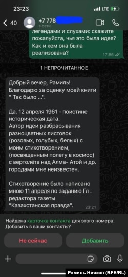 В переписке с корреспондентом Сибирь.Реалии 87-летний Олжас Сулейменов признался, что не знает, кто придумал разбросать его стихотворение с самолета (по другой версии – с вертолета). Прием вполне американский, "шестидесятнический", и он сработал. После того как Сулейменов опубликовал свою поэму, про стихотворца из центральноазиатского города узнал весь мир.